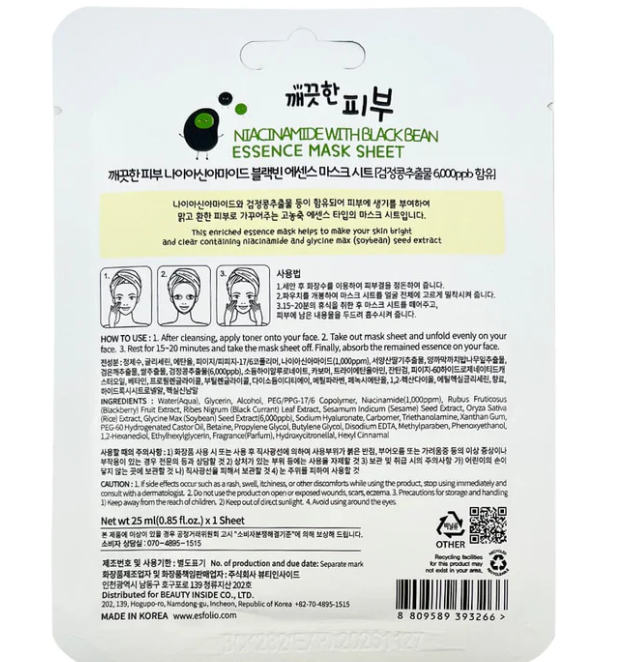 Esfolio Niacinamide with Black Bean Essence Mask (10 Sheets)