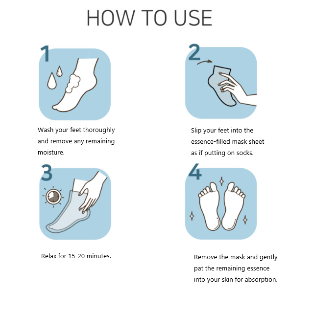 - Just like putting on socks, put on the foot mask to allow its rich essence to nourish your feet.